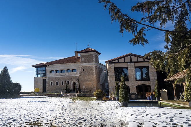 Una manada de 24 bisontes europeos camina con parsimonia sobre un espeso manto de nieve, mientras el sol de enero va derritiendo las copas heladas de pinos y robles. Dos crías rezagadas hunden sus pezuñas y meten el hocico en busca de rastrojos. Al menos no hay depredadores a la vista. Estamos en tierras de Castilla, pero esta atípica escena bien podría transcurrir en la estepa siberiana. La borrasca Filomena se ha dejado caer también por La Serreta, cubriendo de blanco esta finca de 600 hectáreas situada en el municipio segoviano de Lastras de Cuéllar. En medio de este paisaje atravesado por el río Cega, que acoge también a un rebaño de 500 ovejas merinas negras, 180 ciervos y caballos de polo, los Bison bonasus (nombre científico de esta especie) parecen estar en la gloria.
